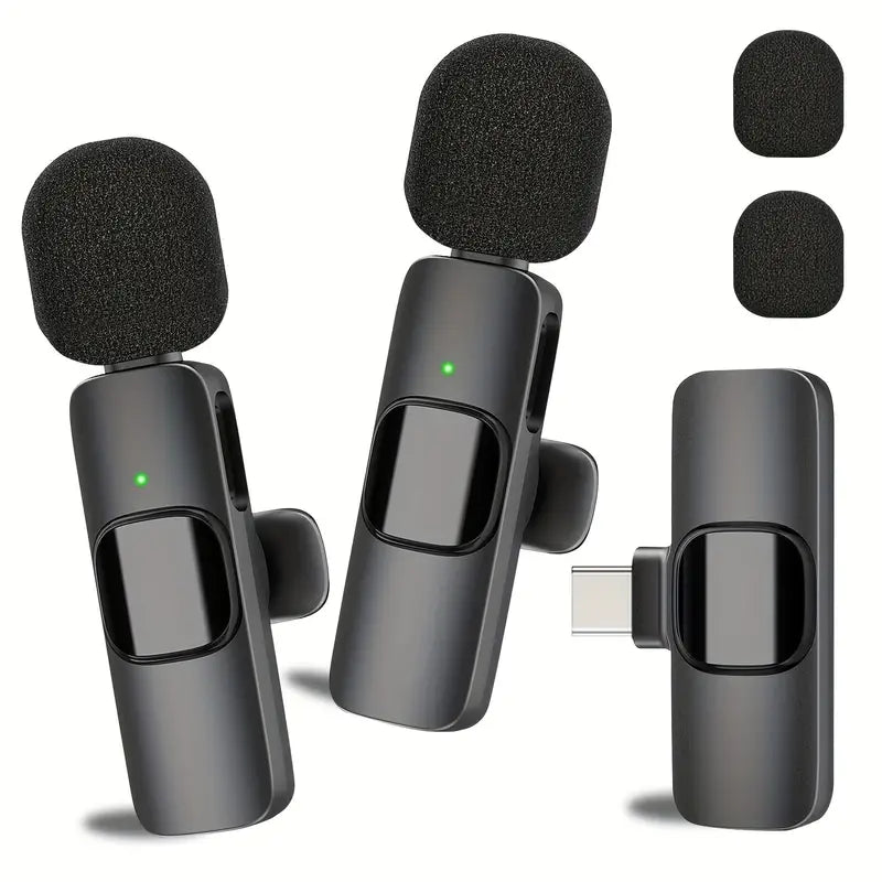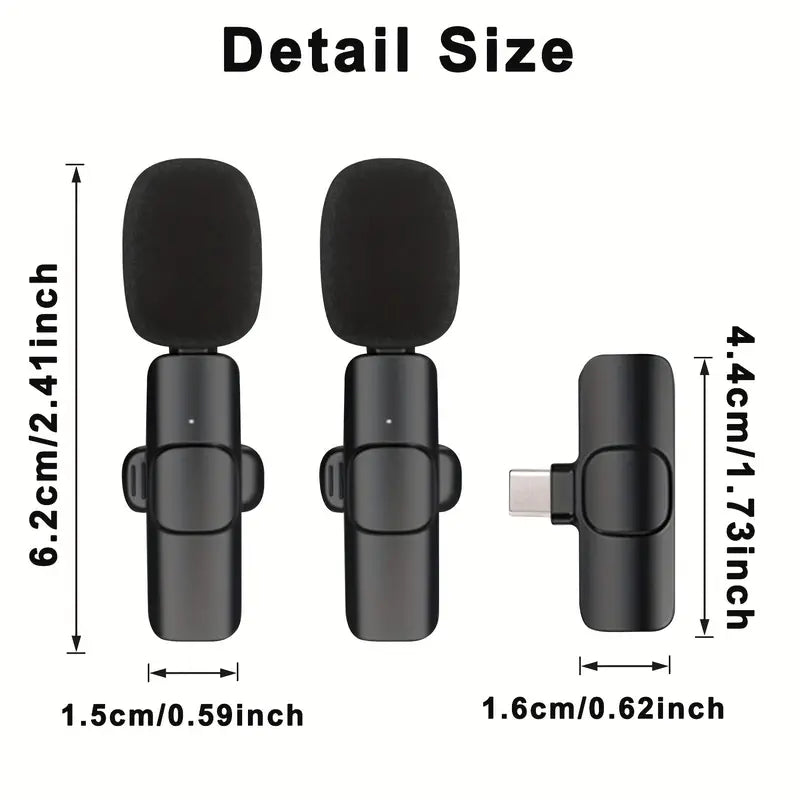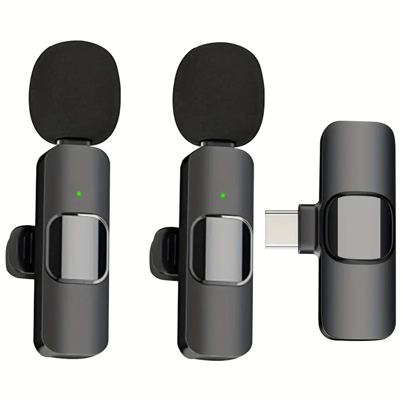 Wireless Lavalier Microphone for iPhone and USB-C Devices is a compact, clip-on microphone designed for hands-free audio recording. It connects wirelessly to smartphones and tablets using either a USB-C connector (for Android and other compatible devices) or a special connector for iPhones.